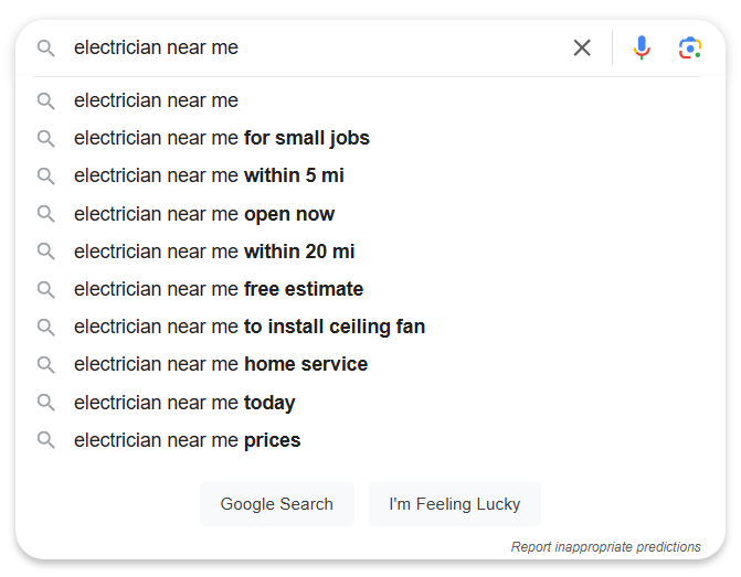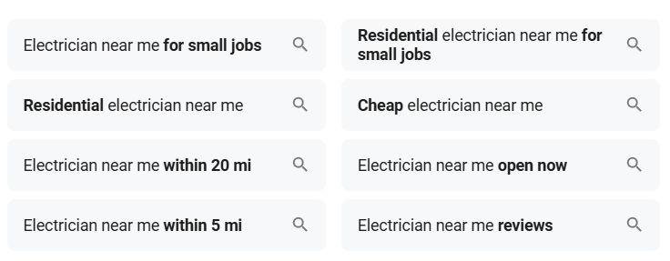 A person searching for an electrician on Google may use a search query like “electrician near me” or “best electrician in [city name]”.