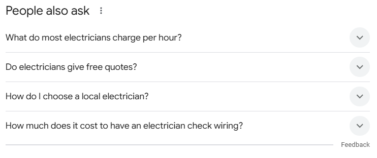 For example, Google “electrical rewiring” and you’ll get a list of related questions people ask (which you can answer with blog content).