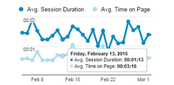 There is often confusion between SEO consultants on average session duration and average time on page, which are two metrics shown in Google analytics (below).