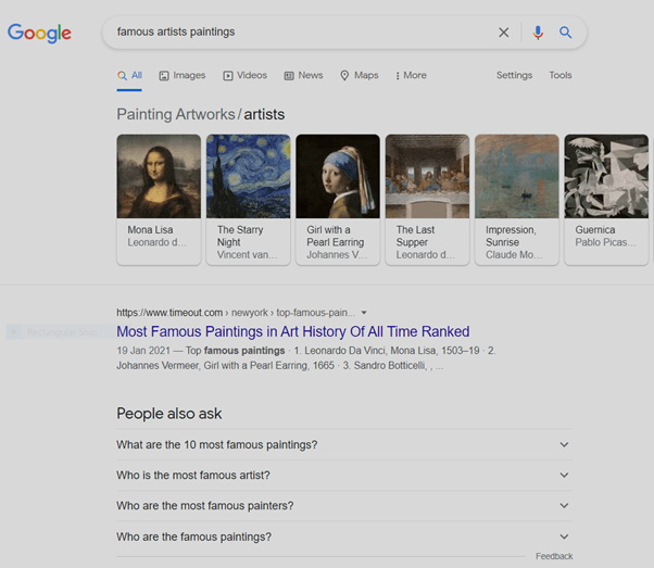 A keyword is anything that is searched on a search engine, whether it is a single word or a phrase. Here is the page of results for the keyword “famous artists paintings.”