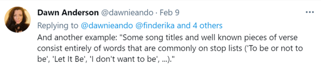 It’s important to remember how these SEO stop words can change the contextual meaning of our speech and writing, as Dawn Anderson points out: