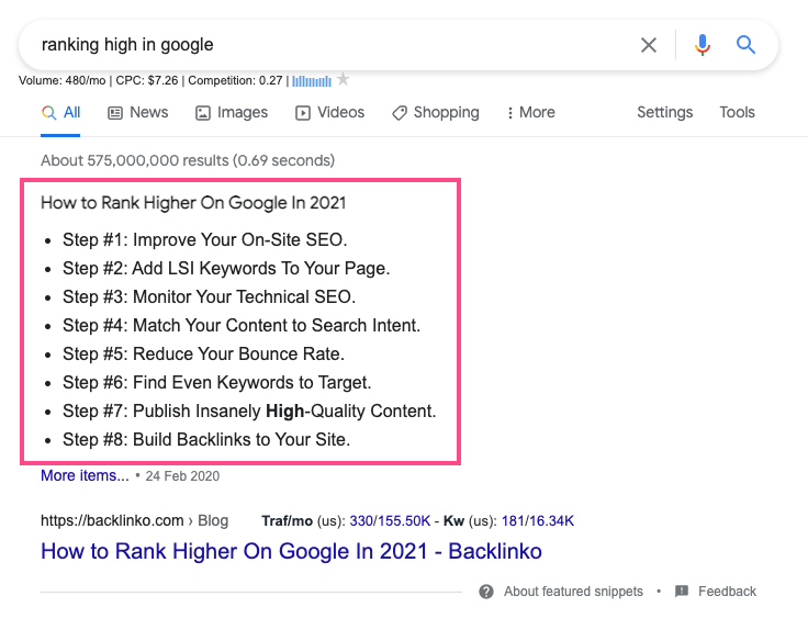 When we ask Google “how to rank high in Google”, we see these eight steps.